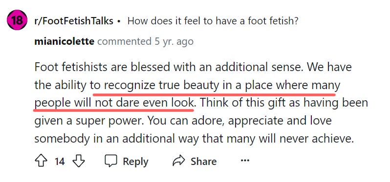 You can see her going on this crusade throughout her posts: against people who think foot fetish is weird or gross. Against the shame people feel about their own desire. And against indulgences people seek that might harm them.